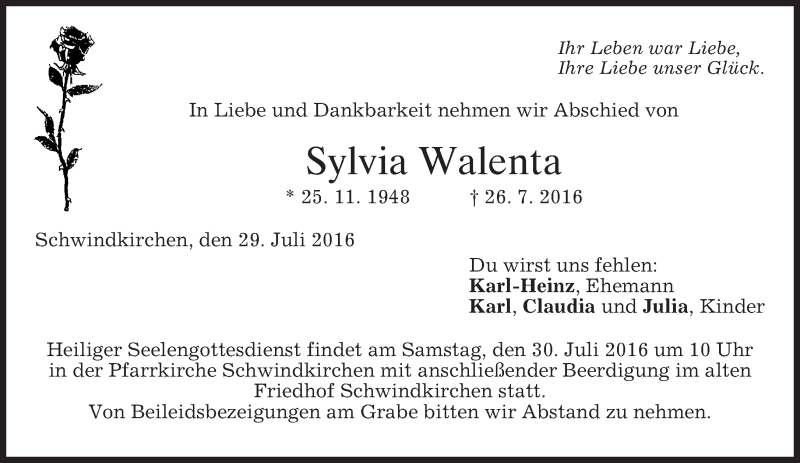 Hier finden Sie alle Traueranzeigen aus der Zeitung, die bisher für Sylvia Walenta erschienen sind. Weitere Traueranzeigen, die in der Zeitung erscheinen, werden hier ebenfalls aufgelistet