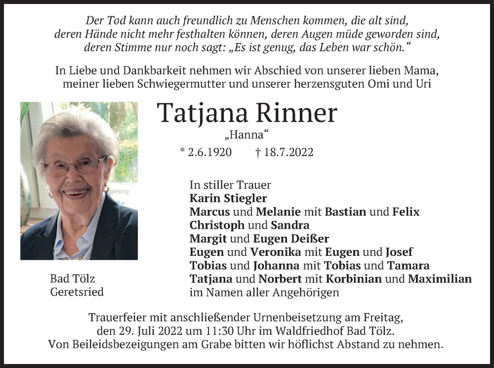 Hier finden Sie alle Traueranzeigen aus der Zeitung, die bisher für Tatjana Rinner erschienen sind. Weitere Traueranzeigen, die in der Zeitung erscheinen, werden hier ebenfalls aufgelistet