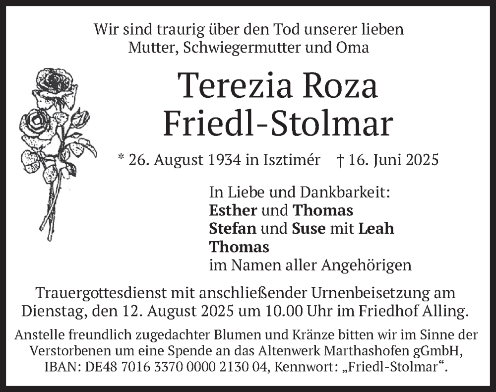 Hier finden Sie alle Traueranzeigen aus der Zeitung, die bisher für Terezia Roza Friedl-Stolmar erschienen sind. Weitere Traueranzeigen, die in der Zeitung erscheinen, werden hier ebenfalls aufgelistet