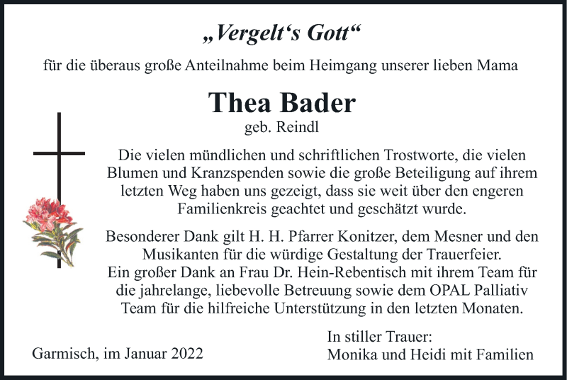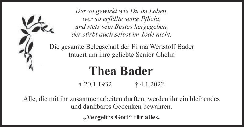 Hier finden Sie alle Traueranzeigen aus der Zeitung, die bisher für Thea Bader erschienen sind. Weitere Traueranzeigen, die in der Zeitung erscheinen, werden hier ebenfalls aufgelistet