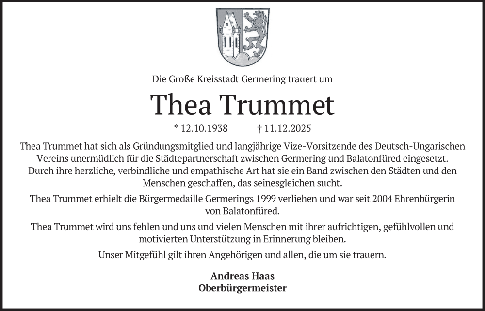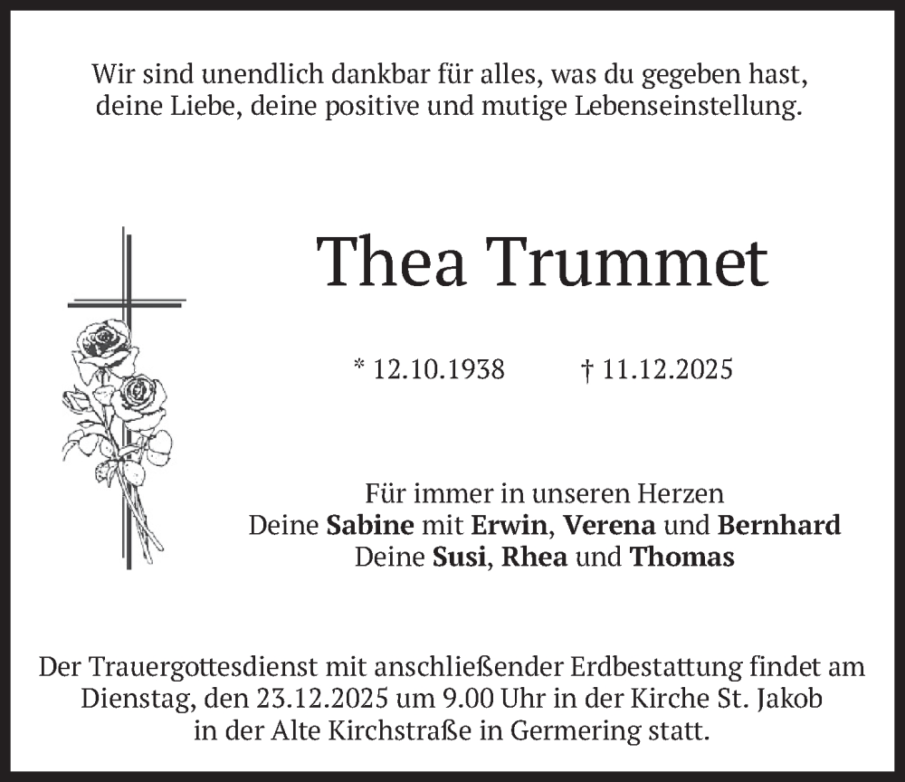 Hier finden Sie alle Traueranzeigen aus der Zeitung, die bisher für Thea Trummet erschienen sind. Weitere Traueranzeigen, die in der Zeitung erscheinen, werden hier ebenfalls aufgelistet