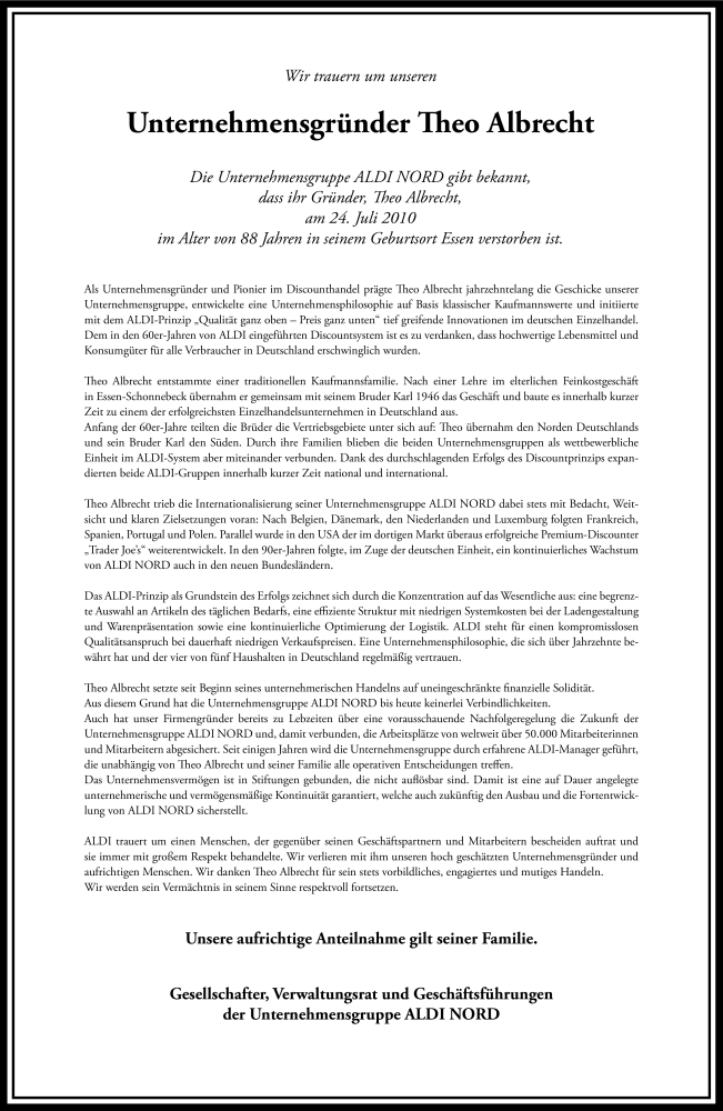 Hier finden Sie alle Traueranzeigen aus der Zeitung, die bisher für Theo Albrecht erschienen sind. Weitere Traueranzeigen, die in der Zeitung erscheinen, werden hier ebenfalls aufgelistet