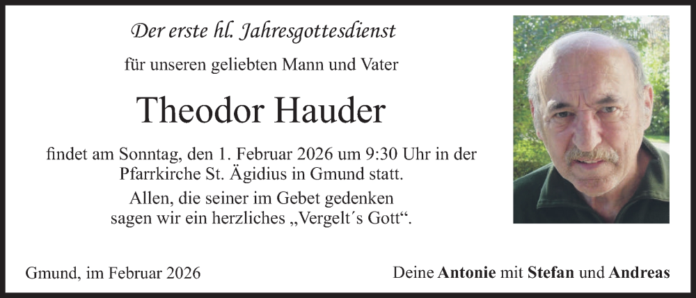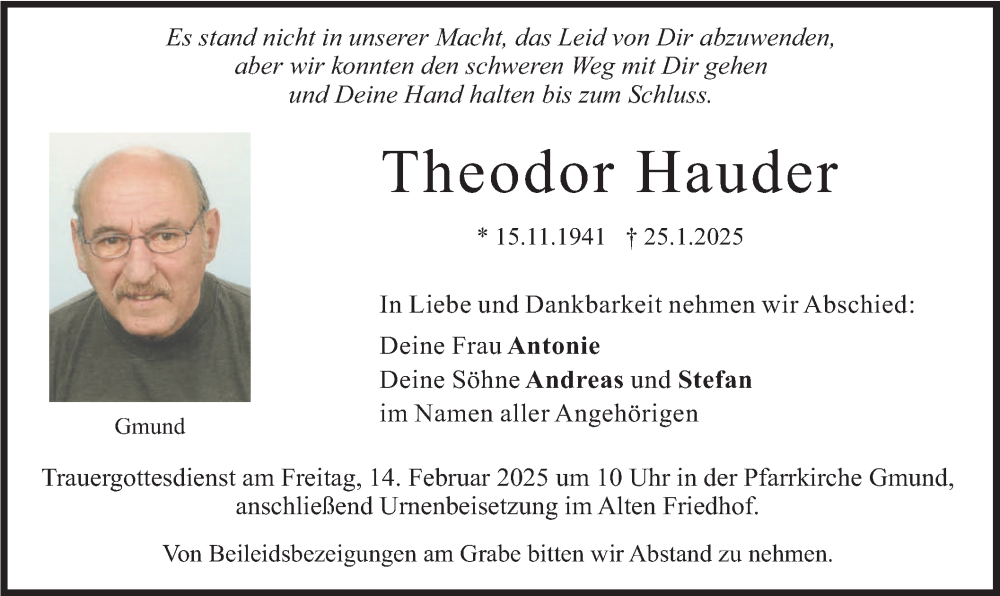 Hier finden Sie alle Traueranzeigen aus der Zeitung, die bisher für Theodor Hauder erschienen sind. Weitere Traueranzeigen, die in der Zeitung erscheinen, werden hier ebenfalls aufgelistet
