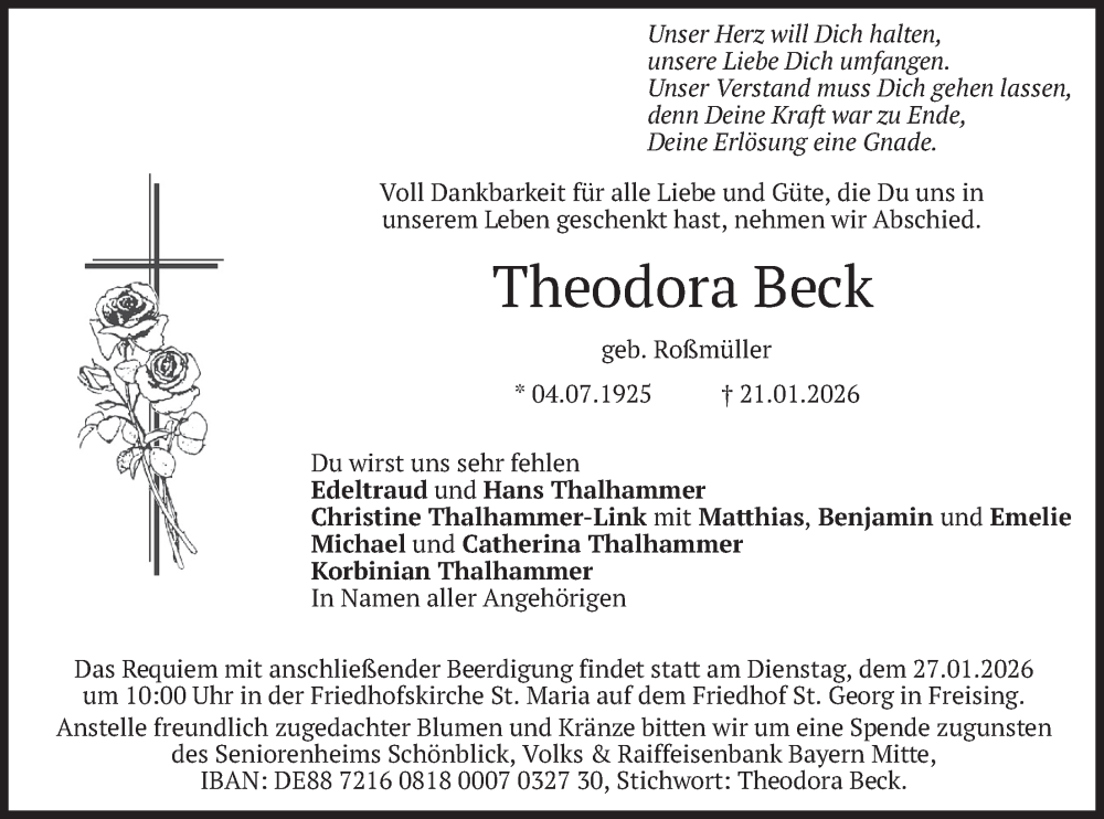 Hier finden Sie alle Traueranzeigen aus der Zeitung, die bisher für Theodora Beck erschienen sind. Weitere Traueranzeigen, die in der Zeitung erscheinen, werden hier ebenfalls aufgelistet