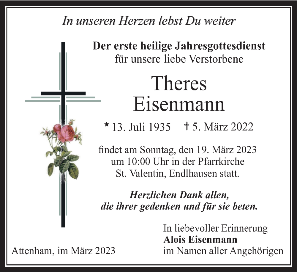 Hier finden Sie alle Traueranzeigen aus der Zeitung, die bisher für Theres Eisenmann erschienen sind. Weitere Traueranzeigen, die in der Zeitung erscheinen, werden hier ebenfalls aufgelistet