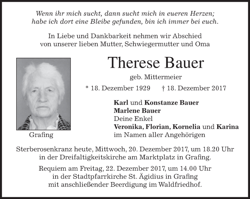 Hier finden Sie alle Traueranzeigen aus der Zeitung, die bisher für Therese Bauer erschienen sind. Weitere Traueranzeigen, die in der Zeitung erscheinen, werden hier ebenfalls aufgelistet