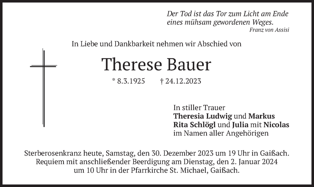 Hier finden Sie alle Traueranzeigen aus der Zeitung, die bisher für Therese Bauer erschienen sind. Weitere Traueranzeigen, die in der Zeitung erscheinen, werden hier ebenfalls aufgelistet