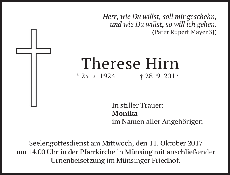 Hier finden Sie alle Traueranzeigen aus der Zeitung, die bisher für Therese Hirn erschienen sind. Weitere Traueranzeigen, die in der Zeitung erscheinen, werden hier ebenfalls aufgelistet