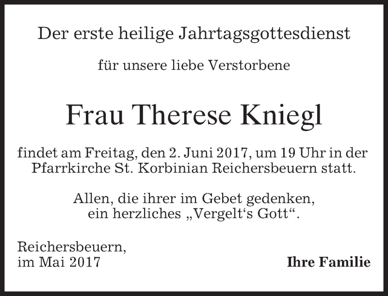 Hier finden Sie alle Traueranzeigen aus der Zeitung, die bisher für Therese Kniegl erschienen sind. Weitere Traueranzeigen, die in der Zeitung erscheinen, werden hier ebenfalls aufgelistet