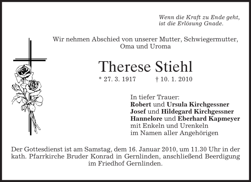 Hier finden Sie alle Traueranzeigen aus der Zeitung, die bisher für Therese Stiehl erschienen sind. Weitere Traueranzeigen, die in der Zeitung erscheinen, werden hier ebenfalls aufgelistet