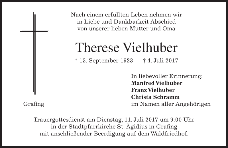 Hier finden Sie alle Traueranzeigen aus der Zeitung, die bisher für Therese Vielhuber erschienen sind. Weitere Traueranzeigen, die in der Zeitung erscheinen, werden hier ebenfalls aufgelistet