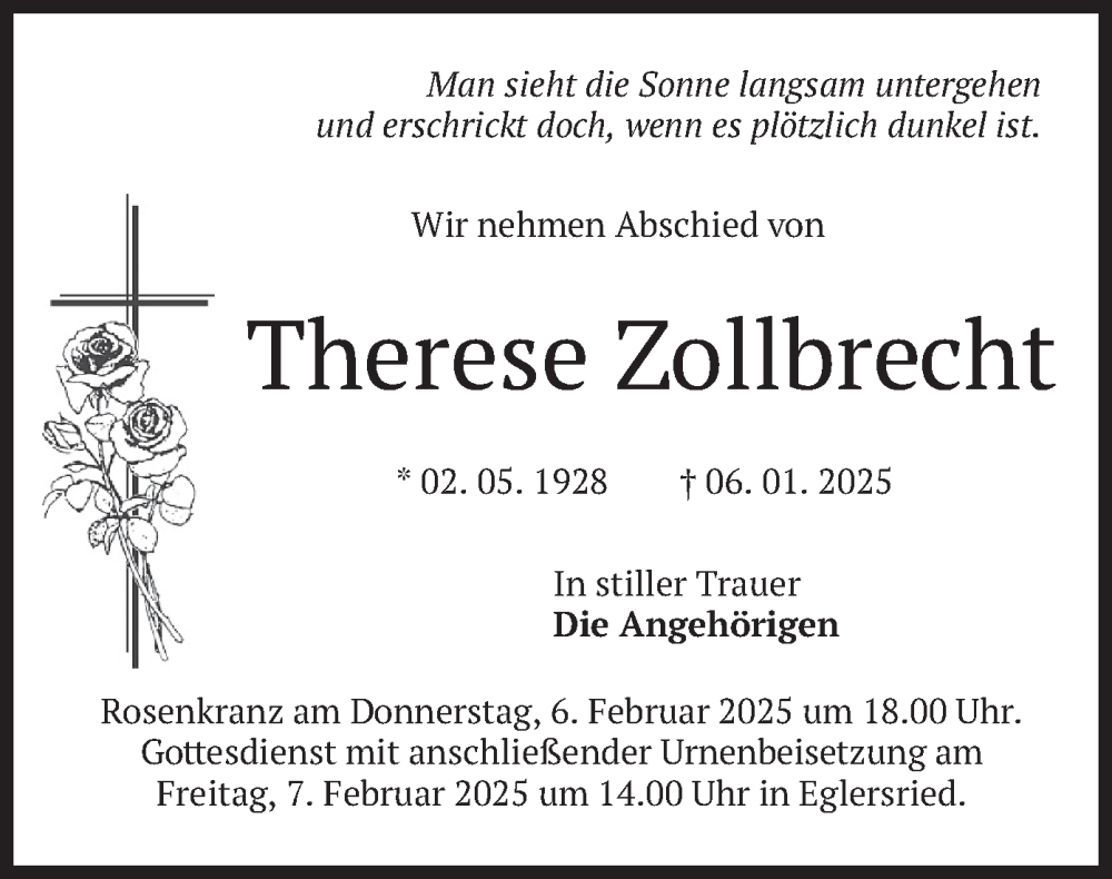 Hier finden Sie alle Traueranzeigen aus der Zeitung, die bisher für Therese Zollbrecht erschienen sind. Weitere Traueranzeigen, die in der Zeitung erscheinen, werden hier ebenfalls aufgelistet
