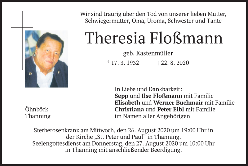 Hier finden Sie alle Traueranzeigen aus der Zeitung, die bisher für Theresia Floßmann erschienen sind. Weitere Traueranzeigen, die in der Zeitung erscheinen, werden hier ebenfalls aufgelistet