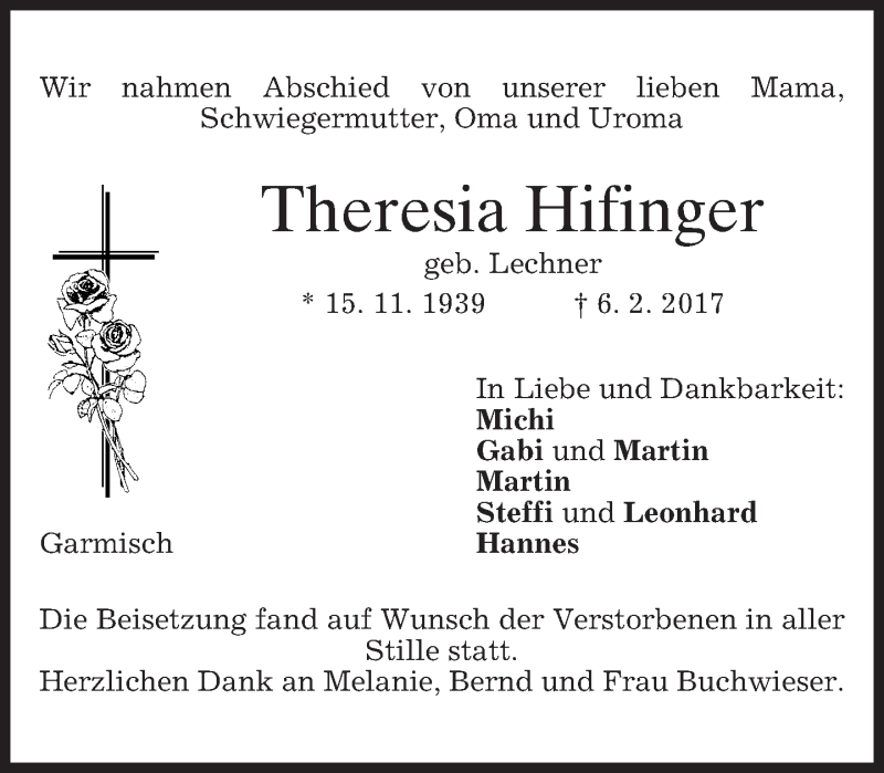 Hier finden Sie alle Traueranzeigen aus der Zeitung, die bisher für Theresia Hifinger erschienen sind. Weitere Traueranzeigen, die in der Zeitung erscheinen, werden hier ebenfalls aufgelistet