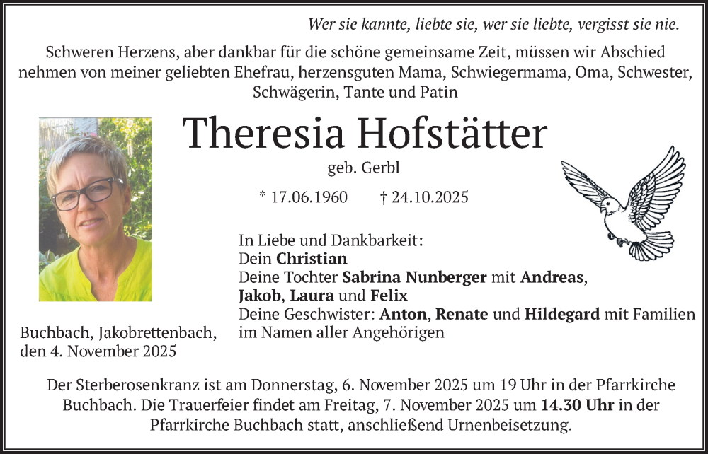 Hier finden Sie alle Traueranzeigen aus der Zeitung, die bisher für Theresia Hofstätter erschienen sind. Weitere Traueranzeigen, die in der Zeitung erscheinen, werden hier ebenfalls aufgelistet