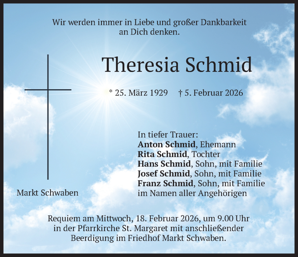 Hier finden Sie alle Traueranzeigen aus der Zeitung, die bisher für Theresia Schmid erschienen sind. Weitere Traueranzeigen, die in der Zeitung erscheinen, werden hier ebenfalls aufgelistet