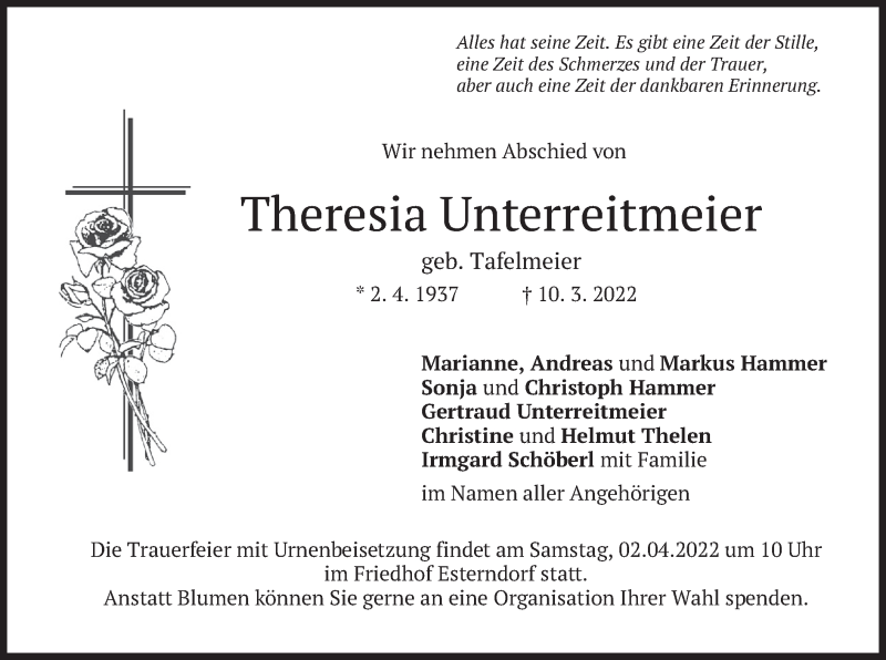 Hier finden Sie alle Traueranzeigen aus der Zeitung, die bisher für Theresia Unterreitmeier erschienen sind. Weitere Traueranzeigen, die in der Zeitung erscheinen, werden hier ebenfalls aufgelistet