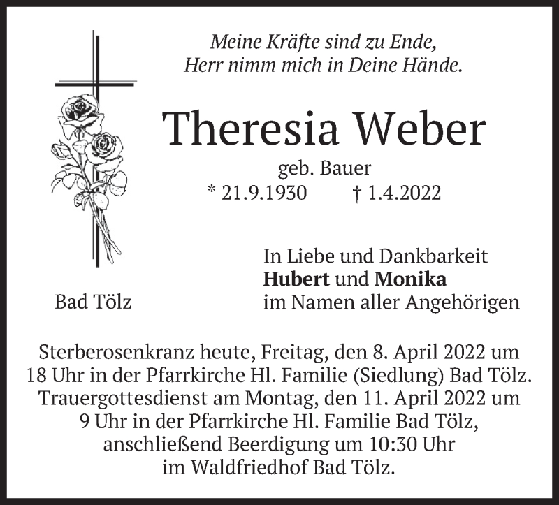 Hier finden Sie alle Traueranzeigen aus der Zeitung, die bisher für Theresia Weber erschienen sind. Weitere Traueranzeigen, die in der Zeitung erscheinen, werden hier ebenfalls aufgelistet