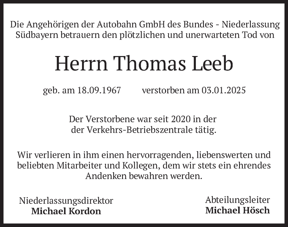 Hier finden Sie alle Traueranzeigen aus der Zeitung, die bisher für Thomas Leeb erschienen sind. Weitere Traueranzeigen, die in der Zeitung erscheinen, werden hier ebenfalls aufgelistet