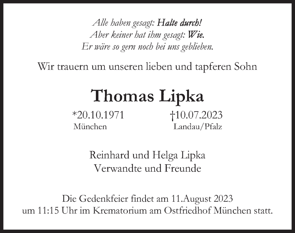 Hier finden Sie alle Traueranzeigen aus der Zeitung, die bisher für Thomas Lipka erschienen sind. Weitere Traueranzeigen, die in der Zeitung erscheinen, werden hier ebenfalls aufgelistet