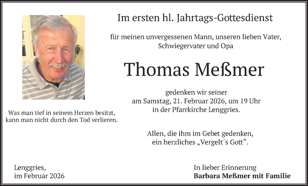 Hier finden Sie alle Traueranzeigen aus der Zeitung, die bisher für Thomas Meßmer erschienen sind. Weitere Traueranzeigen, die in der Zeitung erscheinen, werden hier ebenfalls aufgelistet
