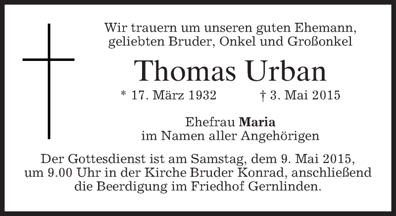 Hier finden Sie alle Traueranzeigen aus der Zeitung, die bisher für Thomas Urban erschienen sind. Weitere Traueranzeigen, die in der Zeitung erscheinen, werden hier ebenfalls aufgelistet