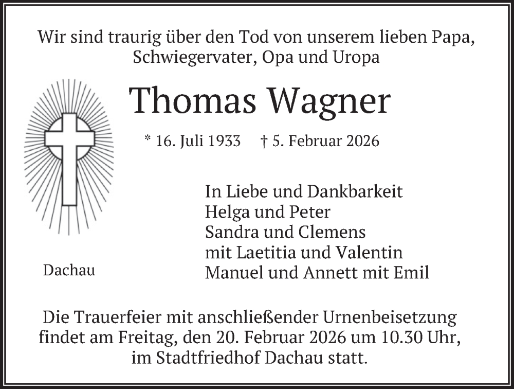 Hier finden Sie alle Traueranzeigen aus der Zeitung, die bisher für Thomas Wagner erschienen sind. Weitere Traueranzeigen, die in der Zeitung erscheinen, werden hier ebenfalls aufgelistet