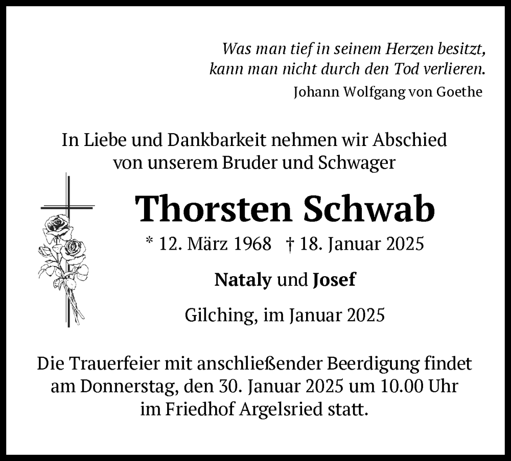 Hier finden Sie alle Traueranzeigen aus der Zeitung, die bisher für Thorsten Schwab erschienen sind. Weitere Traueranzeigen, die in der Zeitung erscheinen, werden hier ebenfalls aufgelistet
