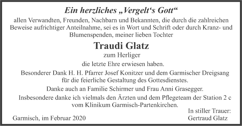 Hier finden Sie alle Traueranzeigen aus der Zeitung, die bisher für Traudi Glatz erschienen sind. Weitere Traueranzeigen, die in der Zeitung erscheinen, werden hier ebenfalls aufgelistet