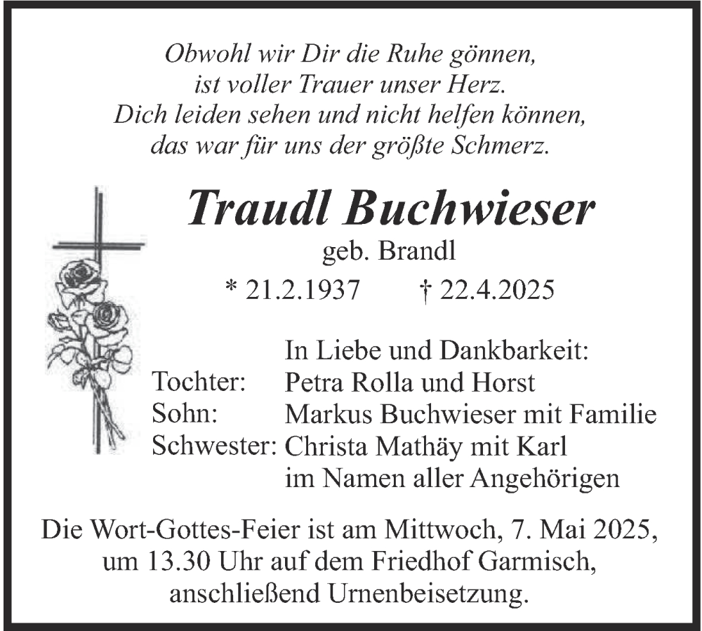 Hier finden Sie alle Traueranzeigen aus der Zeitung, die bisher für Traudl Buchwieser erschienen sind. Weitere Traueranzeigen, die in der Zeitung erscheinen, werden hier ebenfalls aufgelistet