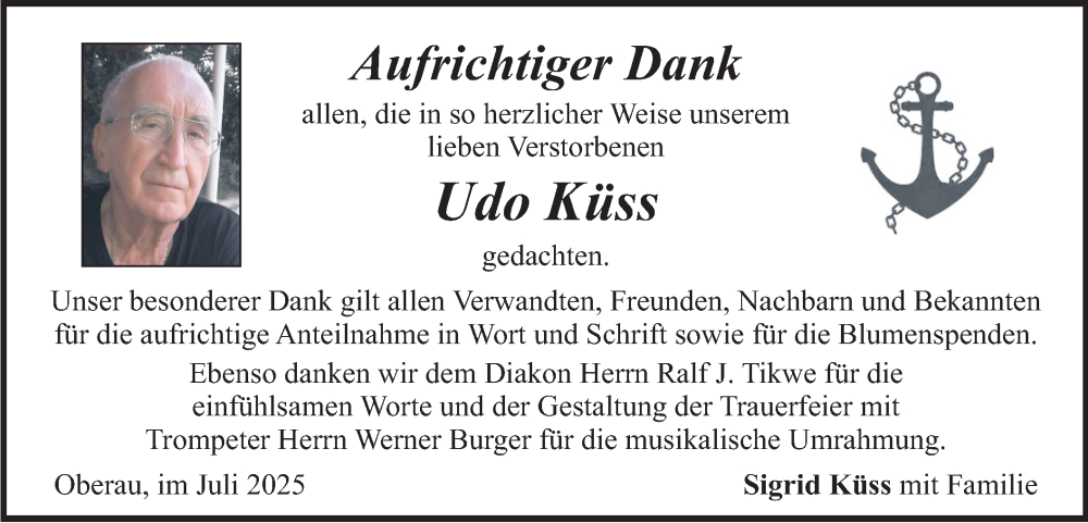 Hier finden Sie alle Traueranzeigen aus der Zeitung, die bisher für Udo Küss erschienen sind. Weitere Traueranzeigen, die in der Zeitung erscheinen, werden hier ebenfalls aufgelistet