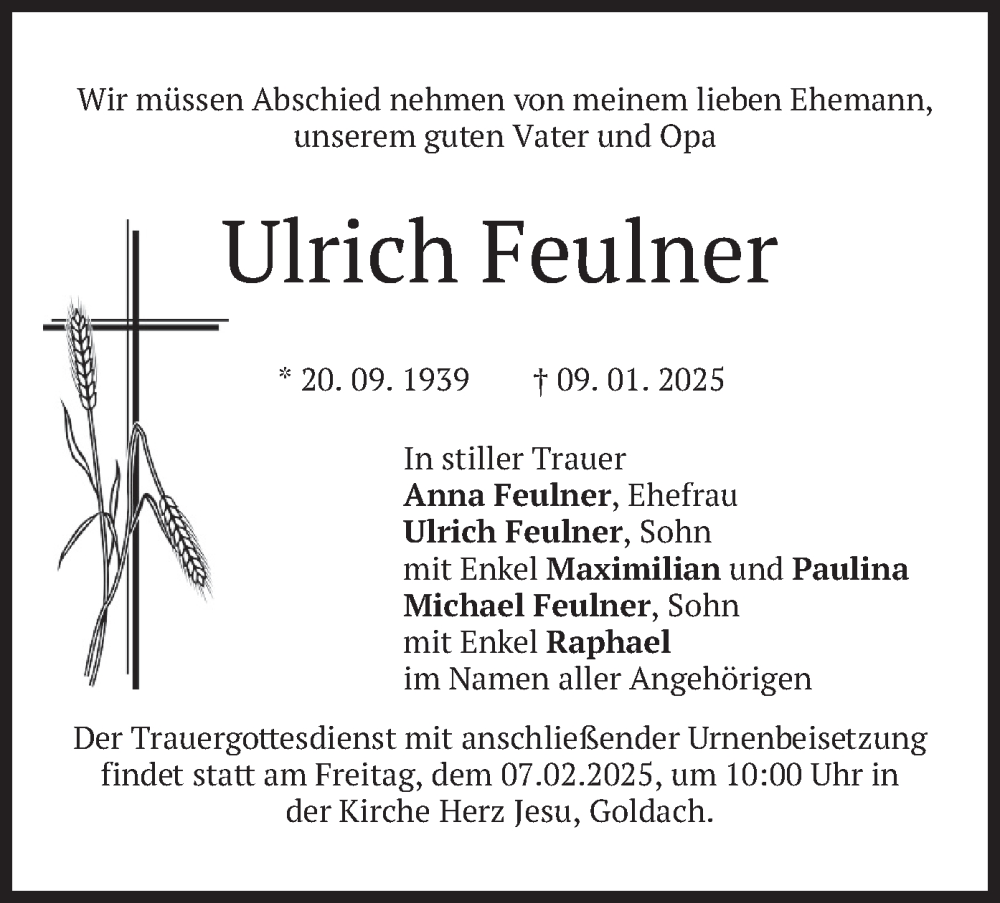 Hier finden Sie alle Traueranzeigen aus der Zeitung, die bisher für Ulrich Feulner erschienen sind. Weitere Traueranzeigen, die in der Zeitung erscheinen, werden hier ebenfalls aufgelistet