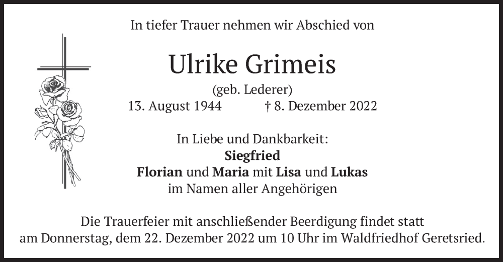 Hier finden Sie alle Traueranzeigen aus der Zeitung, die bisher für Ulrike Grimeis erschienen sind. Weitere Traueranzeigen, die in der Zeitung erscheinen, werden hier ebenfalls aufgelistet