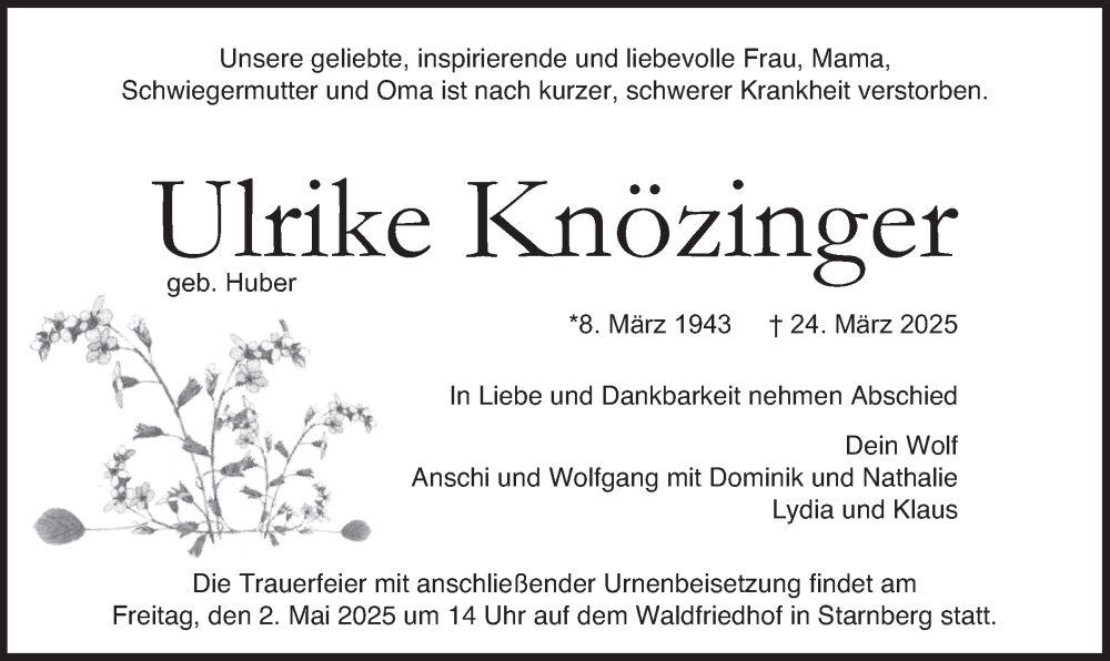 Hier finden Sie alle Traueranzeigen aus der Zeitung, die bisher für Ulrike Knözinger erschienen sind. Weitere Traueranzeigen, die in der Zeitung erscheinen, werden hier ebenfalls aufgelistet
