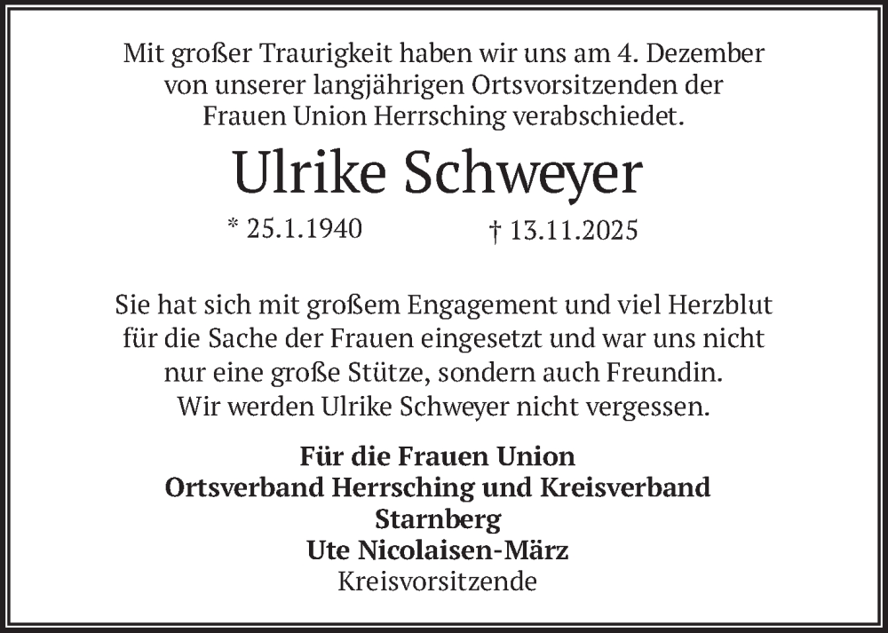 Hier finden Sie alle Traueranzeigen aus der Zeitung, die bisher für Ulrike Schweyer erschienen sind. Weitere Traueranzeigen, die in der Zeitung erscheinen, werden hier ebenfalls aufgelistet
