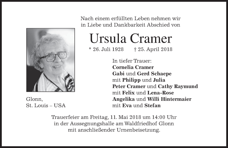 Hier finden Sie alle Traueranzeigen aus der Zeitung, die bisher für Ursula Cramer erschienen sind. Weitere Traueranzeigen, die in der Zeitung erscheinen, werden hier ebenfalls aufgelistet