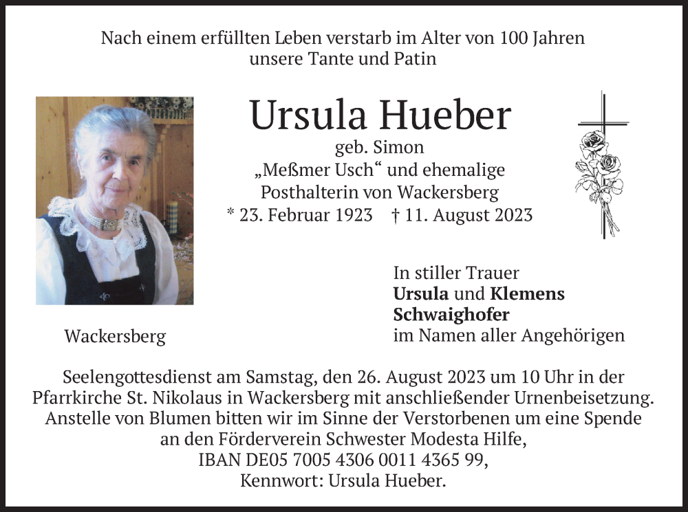 Hier finden Sie alle Traueranzeigen aus der Zeitung, die bisher für Ursula Hueber erschienen sind. Weitere Traueranzeigen, die in der Zeitung erscheinen, werden hier ebenfalls aufgelistet