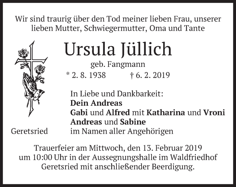 Hier finden Sie alle Traueranzeigen aus der Zeitung, die bisher für Ursula Jüllich erschienen sind. Weitere Traueranzeigen, die in der Zeitung erscheinen, werden hier ebenfalls aufgelistet
