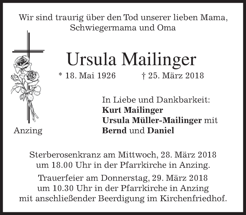 Hier finden Sie alle Traueranzeigen aus der Zeitung, die bisher für Ursula Mailinger erschienen sind. Weitere Traueranzeigen, die in der Zeitung erscheinen, werden hier ebenfalls aufgelistet