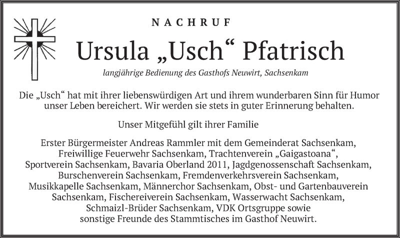Hier finden Sie alle Traueranzeigen aus der Zeitung, die bisher für Ursula Pfatrisch erschienen sind. Weitere Traueranzeigen, die in der Zeitung erscheinen, werden hier ebenfalls aufgelistet