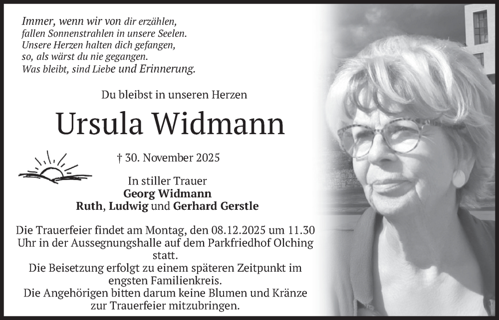 Hier finden Sie alle Traueranzeigen aus der Zeitung, die bisher für Ursula Widmann erschienen sind. Weitere Traueranzeigen, die in der Zeitung erscheinen, werden hier ebenfalls aufgelistet