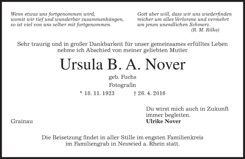 Hier finden Sie alle Traueranzeigen aus der Zeitung, die bisher für Ursula B. A. Nover erschienen sind. Weitere Traueranzeigen, die in der Zeitung erscheinen, werden hier ebenfalls aufgelistet