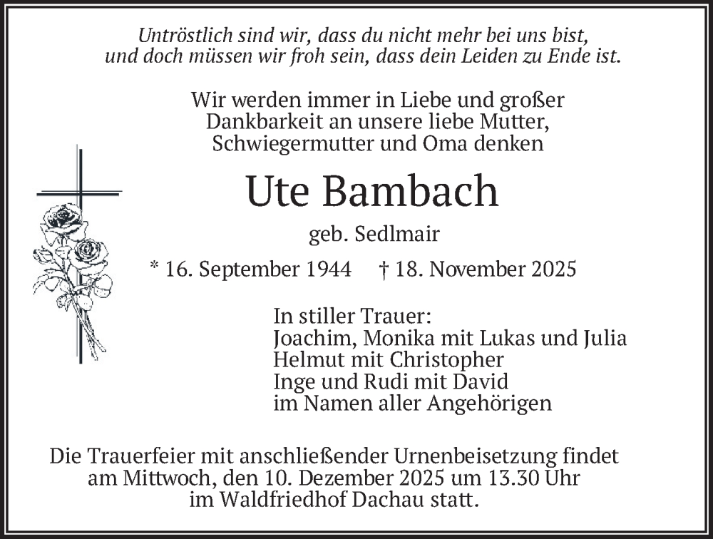 Hier finden Sie alle Traueranzeigen aus der Zeitung, die bisher für Ute Bambach erschienen sind. Weitere Traueranzeigen, die in der Zeitung erscheinen, werden hier ebenfalls aufgelistet