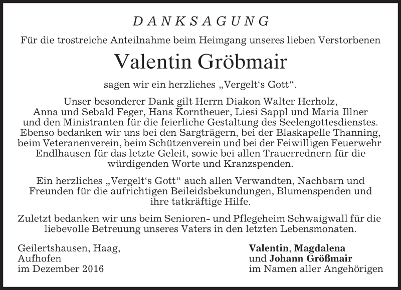 Hier finden Sie alle Traueranzeigen aus der Zeitung, die bisher für Valentin Gröbmair erschienen sind. Weitere Traueranzeigen, die in der Zeitung erscheinen, werden hier ebenfalls aufgelistet