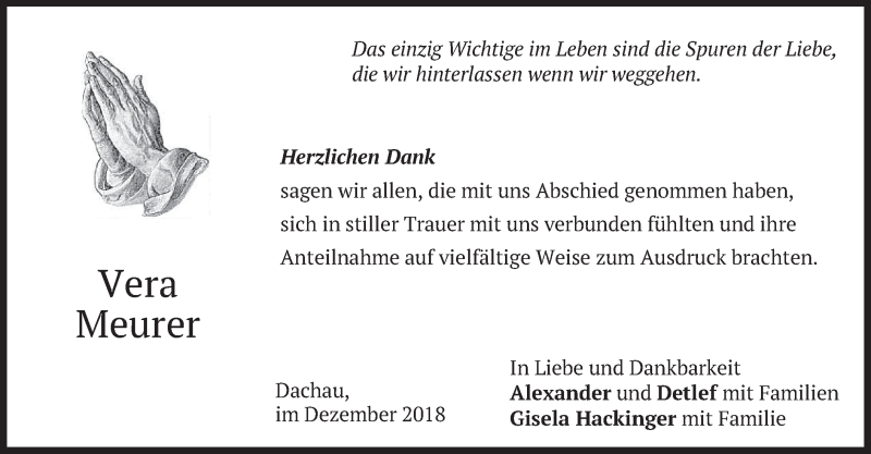 Hier finden Sie alle Traueranzeigen aus der Zeitung, die bisher für Vera Meurer erschienen sind. Weitere Traueranzeigen, die in der Zeitung erscheinen, werden hier ebenfalls aufgelistet