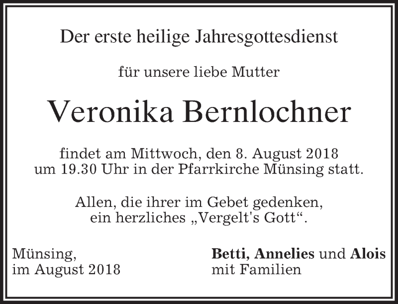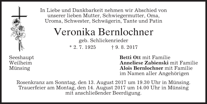 Hier finden Sie alle Traueranzeigen aus der Zeitung, die bisher für Veronika Bernlochner erschienen sind. Weitere Traueranzeigen, die in der Zeitung erscheinen, werden hier ebenfalls aufgelistet