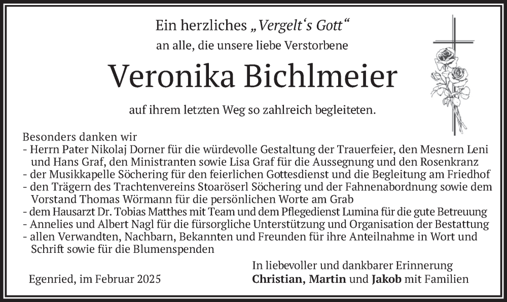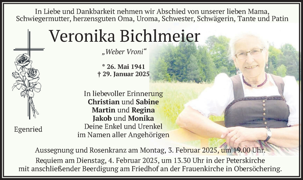 Hier finden Sie alle Traueranzeigen aus der Zeitung, die bisher für Veronika Bichlmeier erschienen sind. Weitere Traueranzeigen, die in der Zeitung erscheinen, werden hier ebenfalls aufgelistet