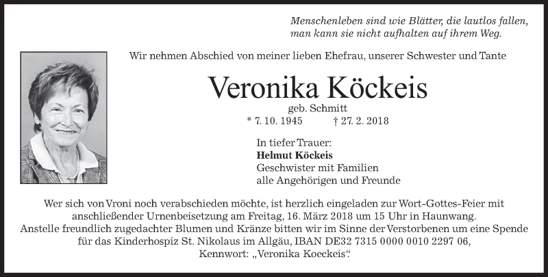 Hier finden Sie alle Traueranzeigen aus der Zeitung, die bisher für Veronika Köckeis erschienen sind. Weitere Traueranzeigen, die in der Zeitung erscheinen, werden hier ebenfalls aufgelistet