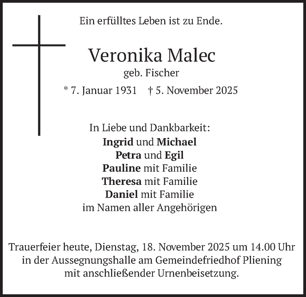 Hier finden Sie alle Traueranzeigen aus der Zeitung, die bisher für Veronika Malec erschienen sind. Weitere Traueranzeigen, die in der Zeitung erscheinen, werden hier ebenfalls aufgelistet