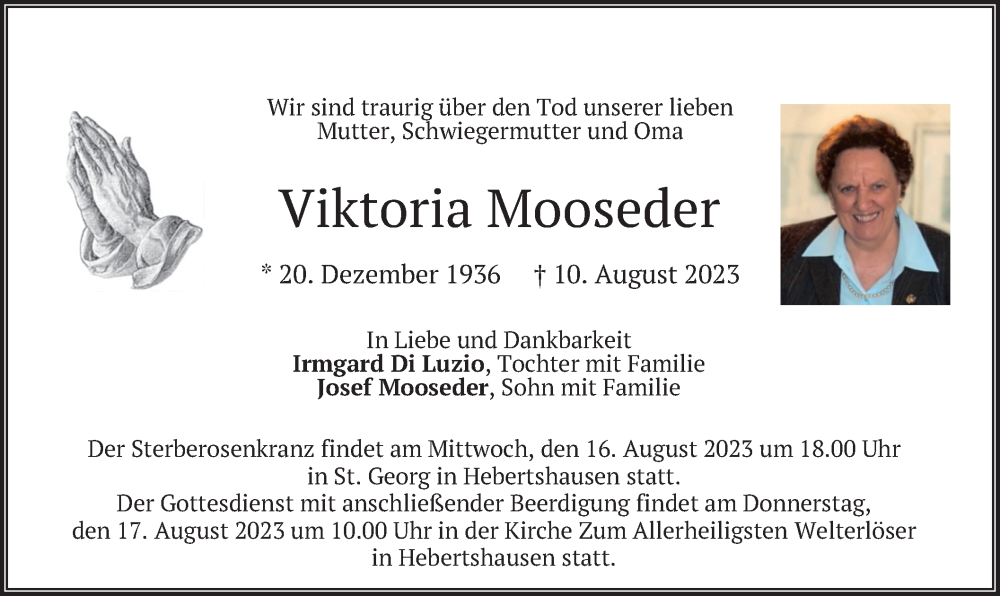 Hier finden Sie alle Traueranzeigen aus der Zeitung, die bisher für Viktoria Mooseder erschienen sind. Weitere Traueranzeigen, die in der Zeitung erscheinen, werden hier ebenfalls aufgelistet
